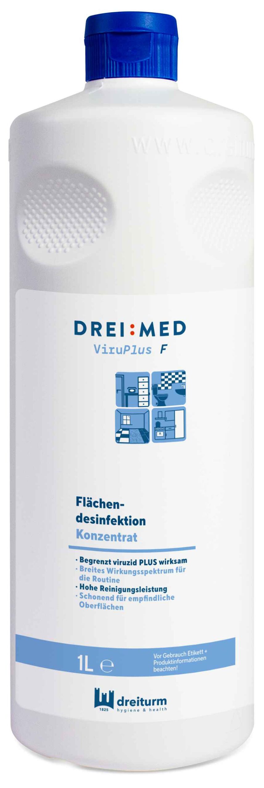 DREIMED® ViruPlus F ist ein vielseitig einsetzbares Flüssigkonzentrat zur Desinfektion und Reinigung von Flächen in der Nähe von Patienten sowie von nichtinvasiven Medizinprodukten.